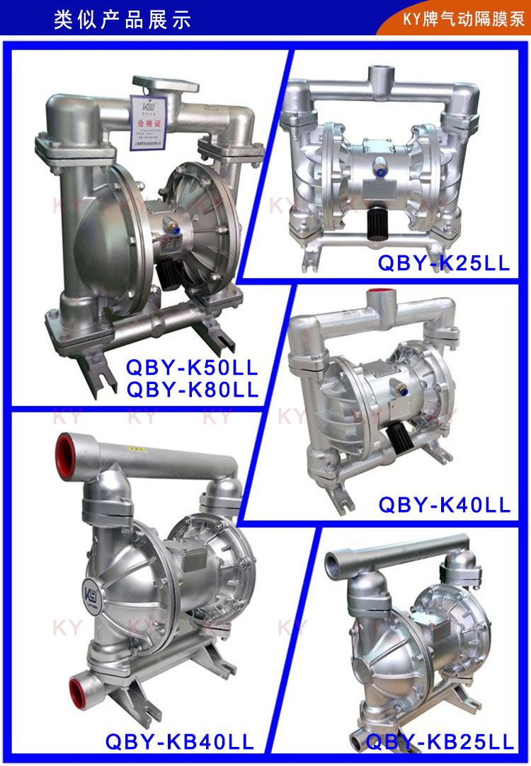 QBY-K65LL氣動隔膜泵是第四代氣動雙隔膜泵,標準名字是QBY-K氣動隔膜泵;它以壓縮空氣為動力;當壓縮氣體進入中間馬達體,馬達體會將壓縮氣體壓入隔膜泵其中一腔從而推動隔膜片運動擠壓液體流出,同時氣動雙隔膜泵的另一腔因為被拉出而吸入液體。當隔膜片到達終點,配氣閥機構自動將壓縮空氣引入泵腔另一端,推動隔膜片朝相反方向運動,從而使隔膜片在泵體的兩個腔做往復運動,抽動液體流動。上??柛裟け脧S家為方便客戶使用,第四代QBYK氣動隔膜泵已經研發了十余種材質生產:鑄鐵氣動雙隔膜泵、鋁合金氣動隔膜泵、不銹鋼304氣動隔膜泵、不銹鋼316L氣動隔膜泵、工程塑料(增強聚丙烯)氣動隔膜泵、氟塑料(PVDF)氣動隔膜泵和耐腐蝕抗壓性能超強的鋼襯氟氣動雙隔膜泵等。