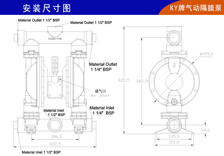 KY261-115不銹鋼氣動隔膜泵是上??柋脴I不斷吸取和學習進口高端氣動隔膜泵的經驗研發成功的最新型國產KY氣動隔膜泵。在泵體和配氣裝置都有革命性的改進,具有無死點、效率高、流量大等特點。廣泛應用于制藥、污水處理、食品、化工、汽車、涂料等行業。水泵的材質有鑄鐵、不銹鋼304氣動隔膜泵、不銹鋼316L氣動隔膜泵等,隔膜片選用高壓復合特氟龍材質,密封座采用不銹鋼材質。KY不銹鋼氣動隔膜泵自吸能力干吸可以達到5米,濕吸8米,在工作壓力8公斤時還可以保證足夠流量輸出。壓濾機板框正常工作需要7公斤左右的壓力才可以正常出泥餅,一般不銹鋼氣動隔膜泵達到7公斤壓力時容易有流量低、效率下降等問題,這時更體現了KY261壓濾機隔膜泵的優勢。因為KY261不銹鋼氣動隔膜泵的特點就是壓力足,在高壓時可以有更大流量,所以大家都稱它是壓濾機隔膜泵。