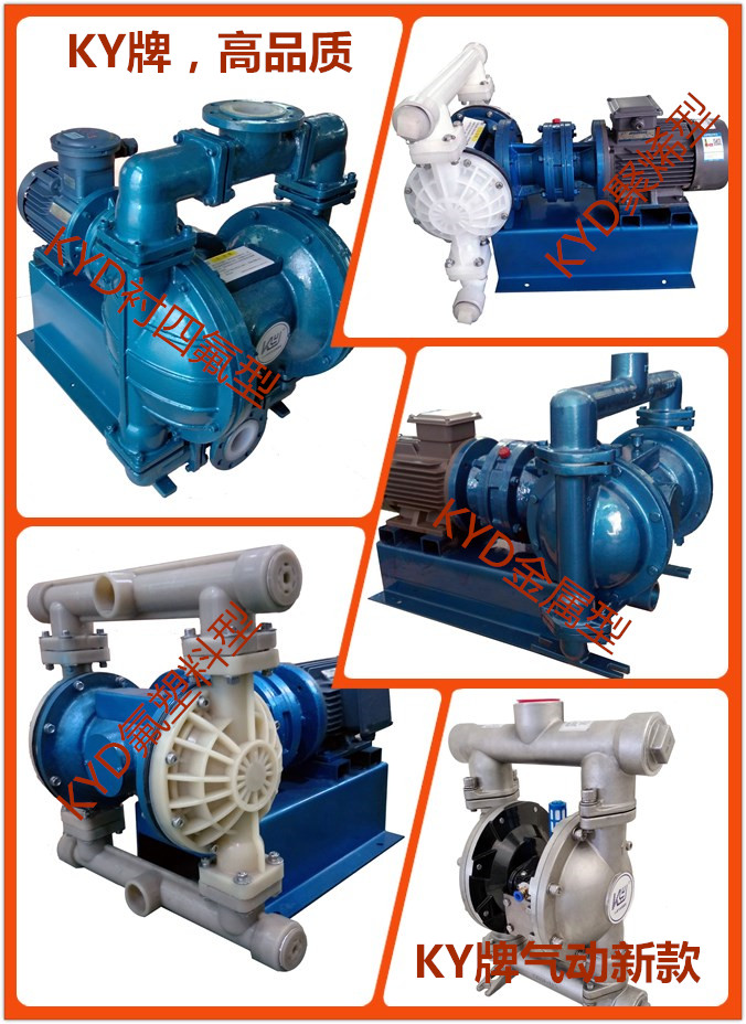 KYD電動隔膜泵是上海楷陽經過數年的研發改進之高品質產品,是具有國際高水平的電動隔膜泵。其材質也取得了突破性的進展,上??柹a的KYD電動隔膜泵主要材質有不銹鋼304電動隔膜泵、不銹鋼316L電動隔膜泵、鑄鋼電動隔膜泵、鋁合金電動隔膜泵、工程塑料(增強聚丙烯)電動隔膜泵、氟塑料(聚偏氟乙烯)電動隔膜泵和耐腐蝕抗壓性能超強的鋼襯氟電動隔膜泵等。既滿足了一些化工、醫藥、水處理等行業的耐腐蝕需求,也可以滿足一些廢水、污泥等粘稠含雜質較多的介質輸送。