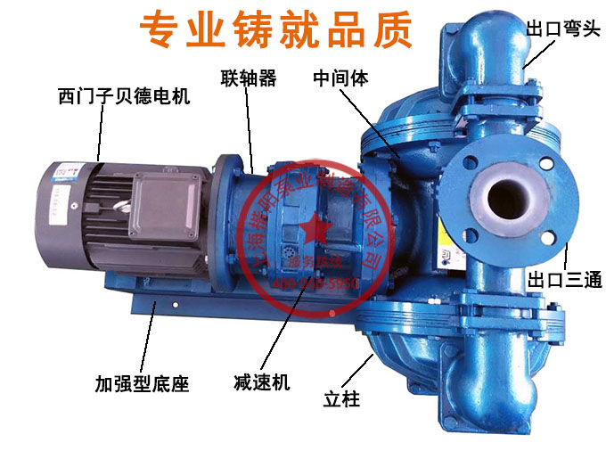 KYD電動隔膜泵是上??柋脴I開發的最新一代電動隔膜泵,整機由西門子貝德電機(也可定做其他品牌電機)、擺針式減速機、聯軸器、泵頭和底座組成。KYD系列產品流量范圍在0.75至28立方米每小時,出口壓力最大可達6公斤;泵體可做鑄鋼、鋁合金、聚丙烯、氟塑料、不銹鋼、鋼襯氟材質,滿足了化工、醫藥、水處理、食品、機械、煤礦、石油、船舶、冶金、陶瓷等行業的不同要求。并且有可空轉、可通過纖維顆粒物、可調速、可不加引水自吸、無軸封等其它泵不具備的優勢,受到各行業一致好評。
